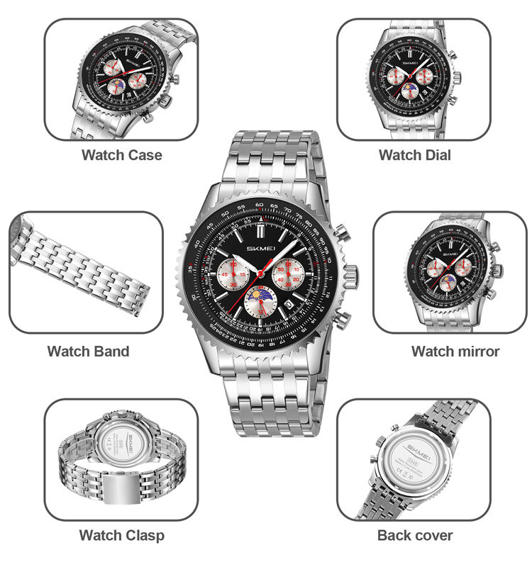 Feature:Moon Phase, Waterproof, Small three needle, Stop Watch, Date