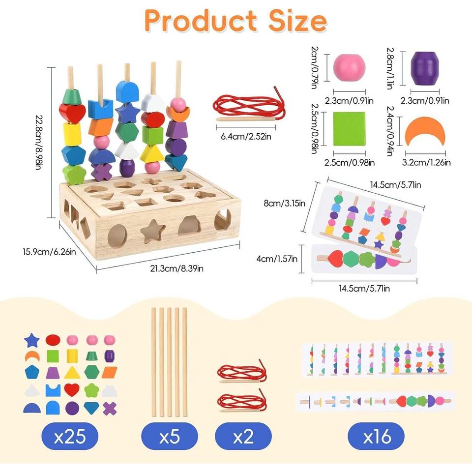 SKY-TOUCH Montessori Wooden 3-in-1 Toy Set for Toddlers Sorting Nesting Stacking Game Geometric Shape Matching Beads Sequencing