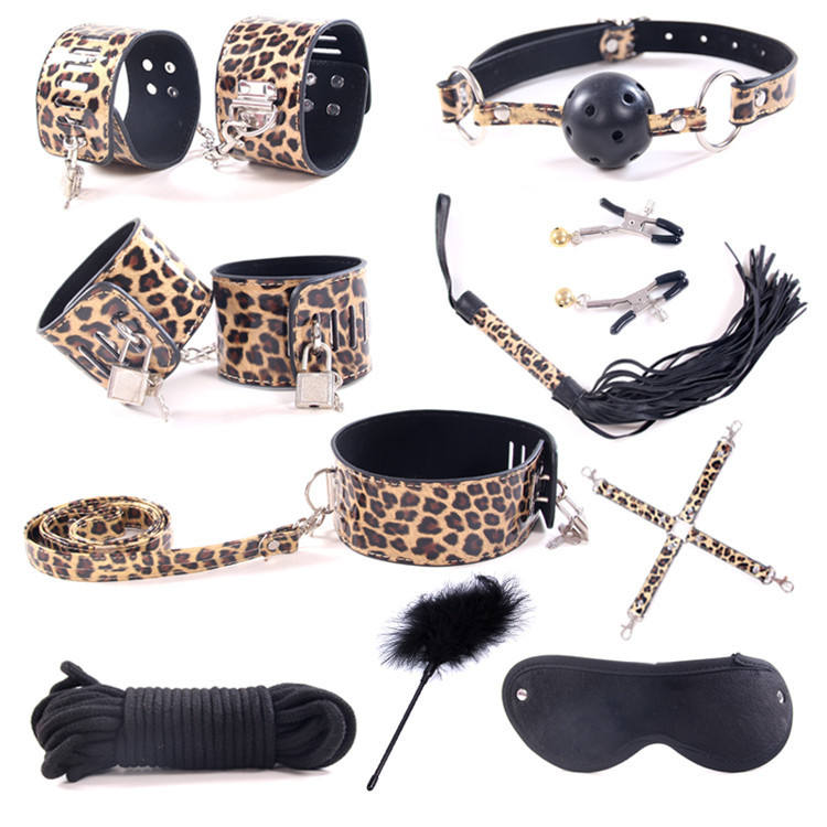 SM for Couples Fetish Roleplay Bondage Leopard Print Leather Handcuffs Whip Collar Gag 18+ Restraint Set