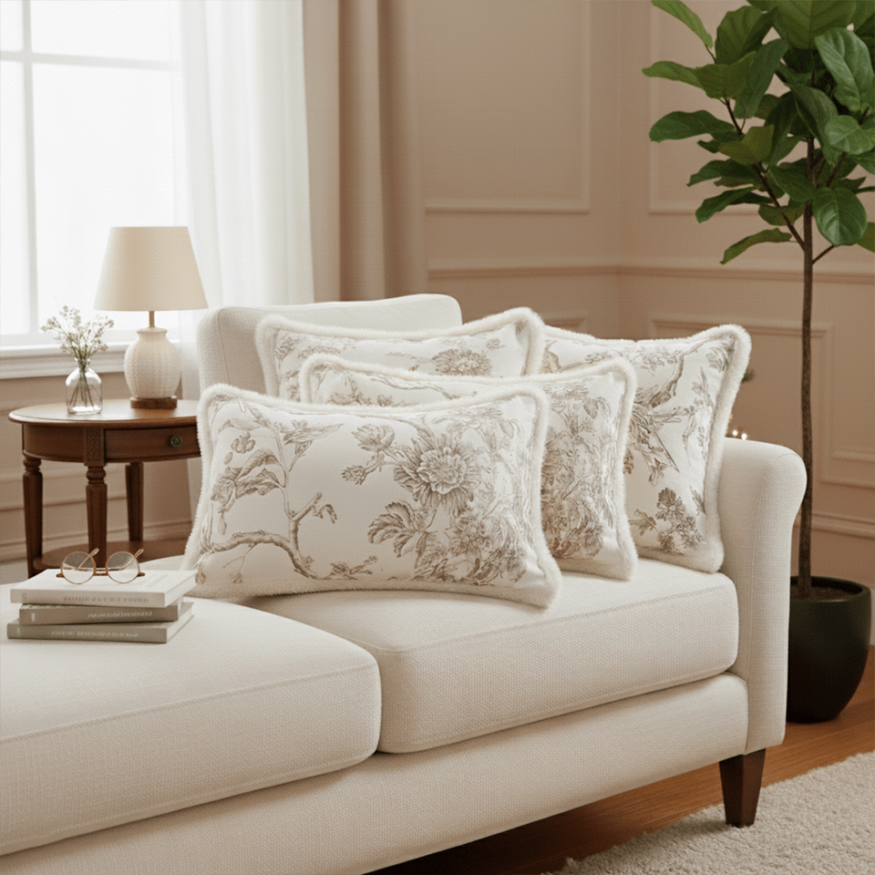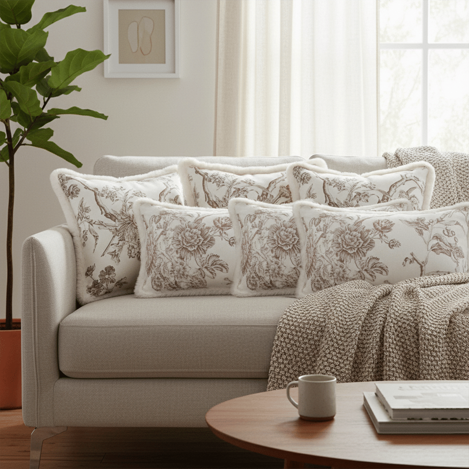 SOGA 6-Piece Pillowcase Set Vintage Floral Fur Trim Taupe Embroidered Cushion Covers 45cm X 45cm 30x50cm Sizes