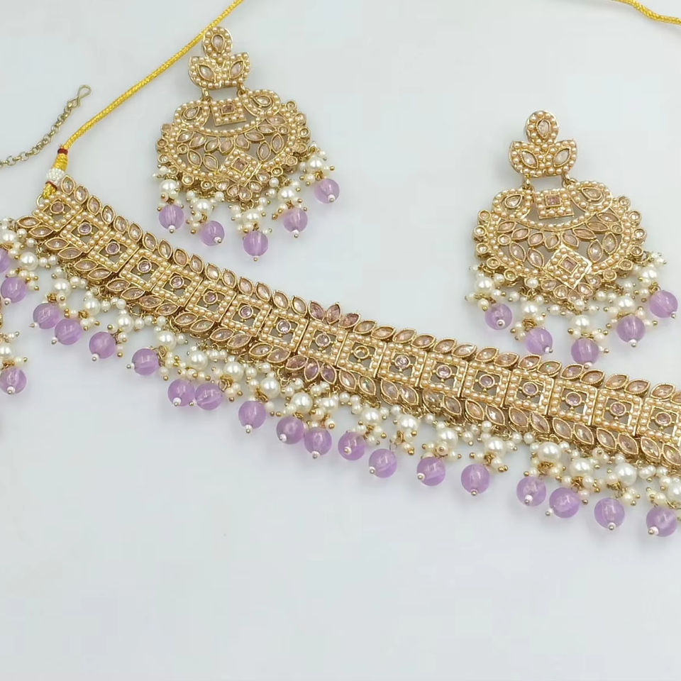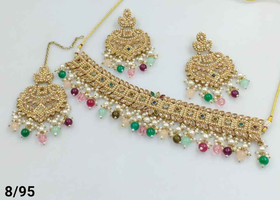 SQUARE SHAPE LATEST DROP FASHIONABLE GOLD PLATED COPPER NECKLACE WITH CHANBALI EARRING MANGTIKKA SET & JEWELLERY SET WOMEN