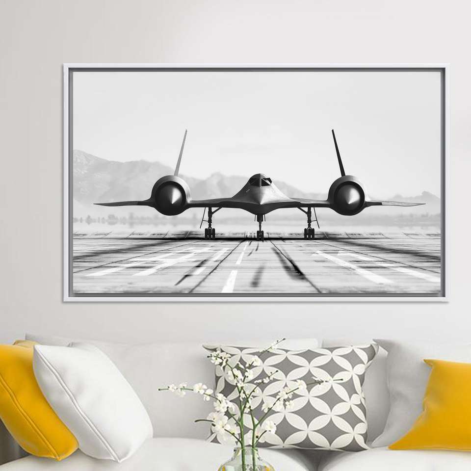 SR-71 Blackbird Canvas Wall Art Monochrome Jet Aircraft Runway Print,WHITE FRAMED CANVAS