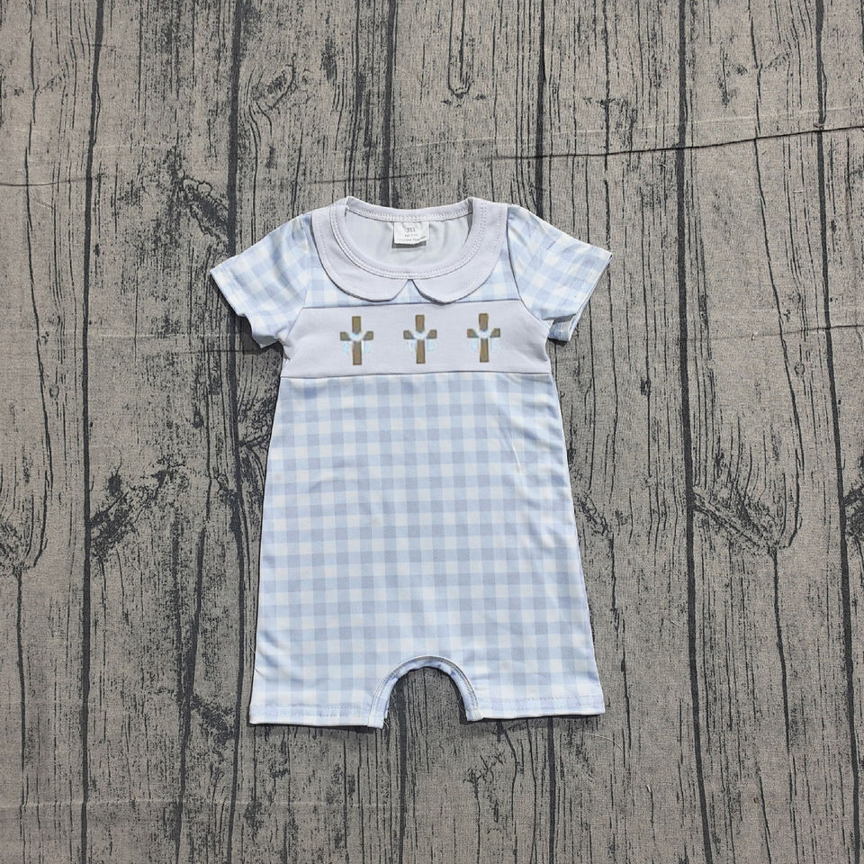 SR3758 CUSTOM Infant Baby brown plaid easter cross Kids Wholesale Romper short Sleeve Jumpsuit boy Bubble