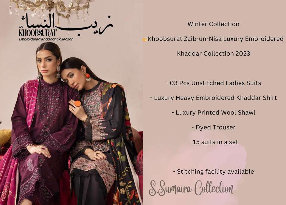 SS Khoobsurat Modest 3 Pc Unstitched Dresses Collection Luxury Embroidered Khaddar Printed Wool Shawl Dyed Chiffon Trouser