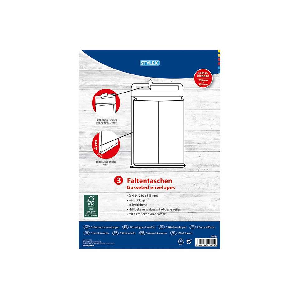 STYLEX folded envelopes DIN B4 adhesive white 3pcs