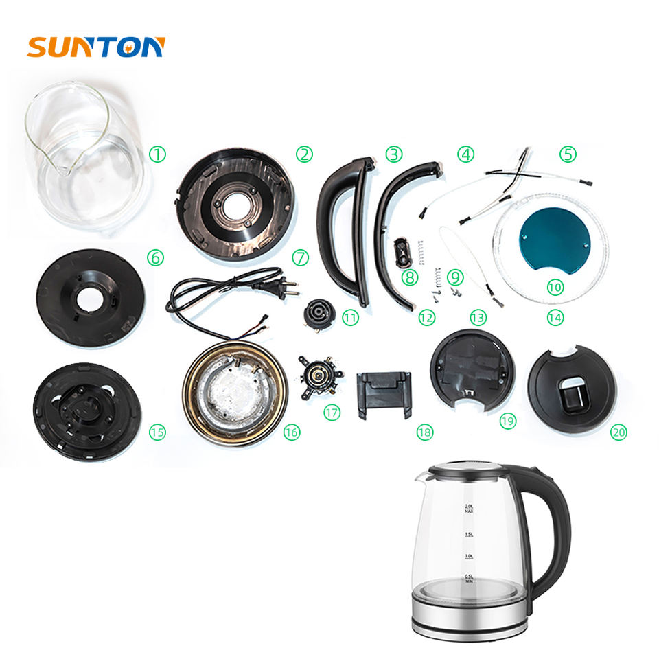 Electric Kettle Parts, Thermostat, Control Panel, Filter, Heating Element, Lid, Handle, Base, Cord, Body, Water Level Indicatortype