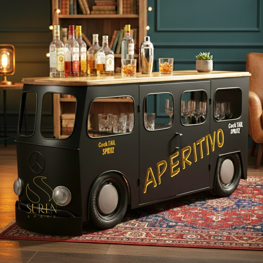 SUREN SPACE SS4428F Industrial Eco-Friendly Iron Home Bar Cabinet with Wood Top 4 Compartments Freestanding for Living Room
