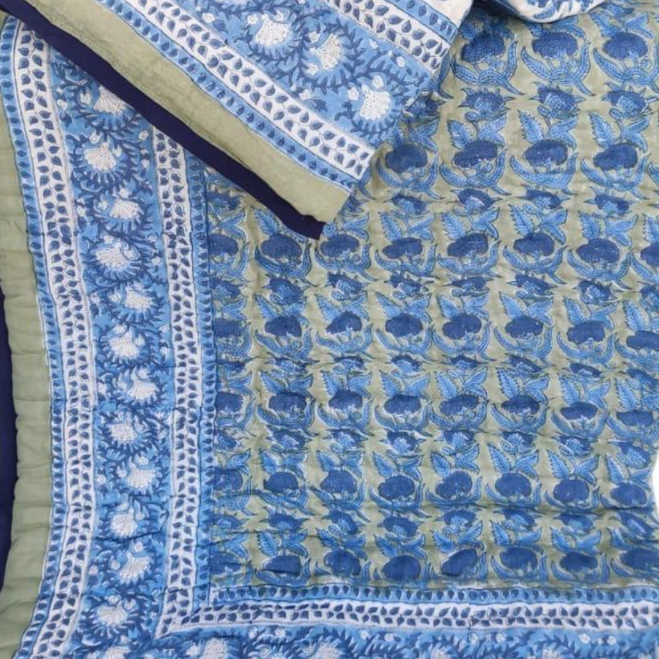 Sage Green Blue Floral Printed Eco-Friendly 300tc Thread Count Pure Cotton Comforter Endless Pattern Hands Reversible Quilt