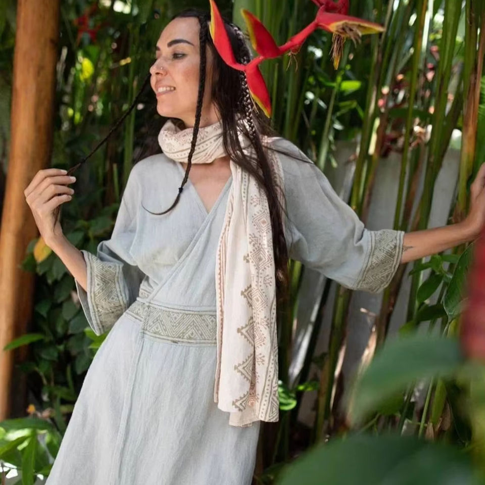 Sage Green Brown Boho Kimono Wrap Dress Hand Block Printed 100% Cotton Casual Mini Style with Belt for Summer Wear