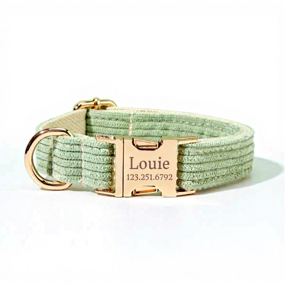 Sage Green Modern Tactical Bowtie Set Personalized Leather Corduroy Dog Collar & Leash Free Engraving Wedding Gift