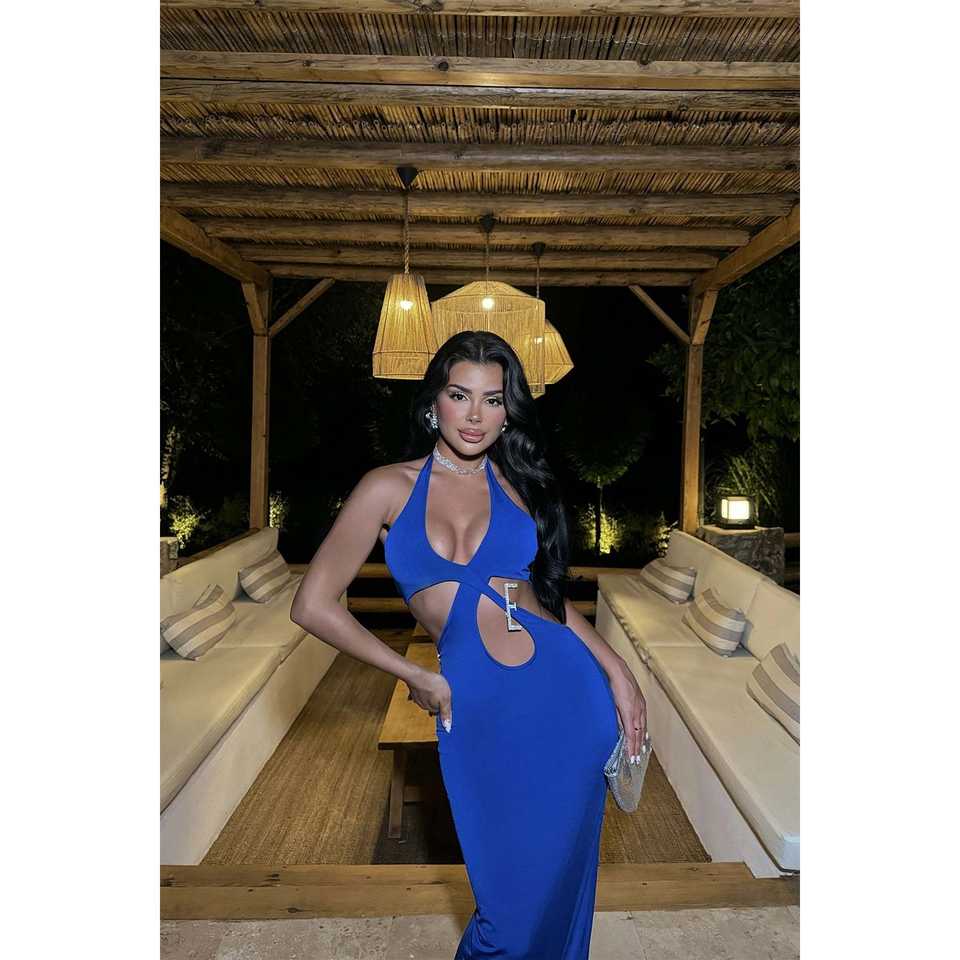 Ristella White Evening Dress Halter Neck with Stone Embroidery Long Length