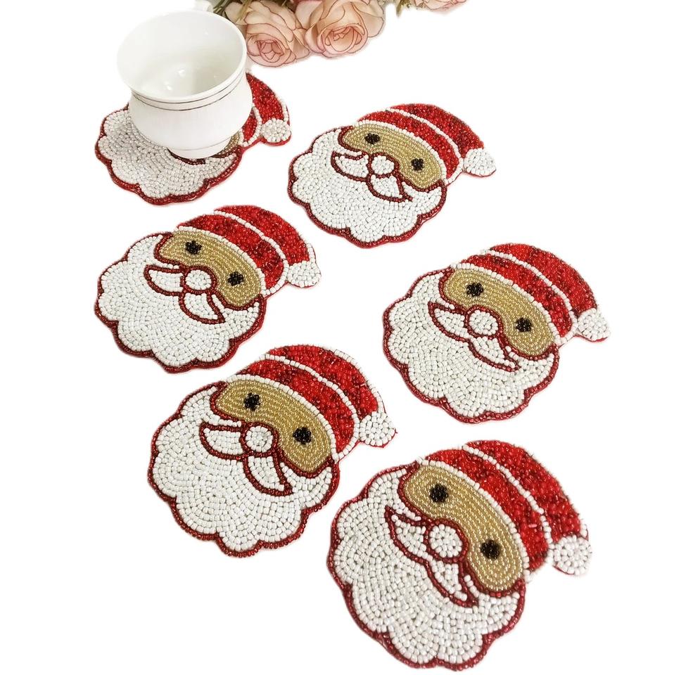 Santa Clause Beaded Christmas-Themed Elegant Glass Table Accent Coaster Mats & Pads for Holiday Parties