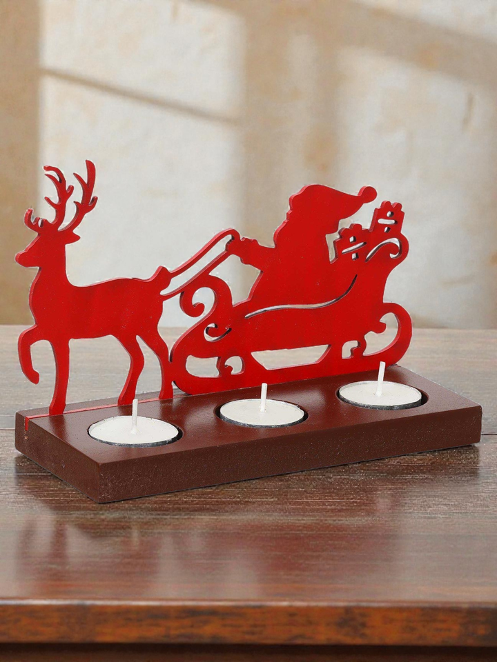 Santa Sleigh Tea Light Holder Red and Black Metal with Wooden Base 3 Candle Christmas Table Decor