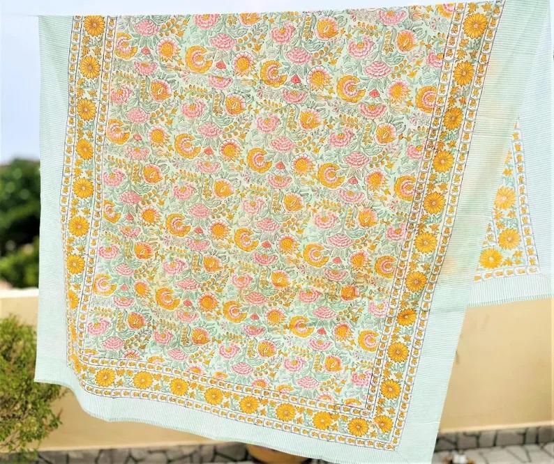 Sarongs, Brunt Orange, Olive Green Floral Hand Block Printed Cotton Sarong, Beach Wrap Pareo Long Scarf Coverup, Boho Style gift