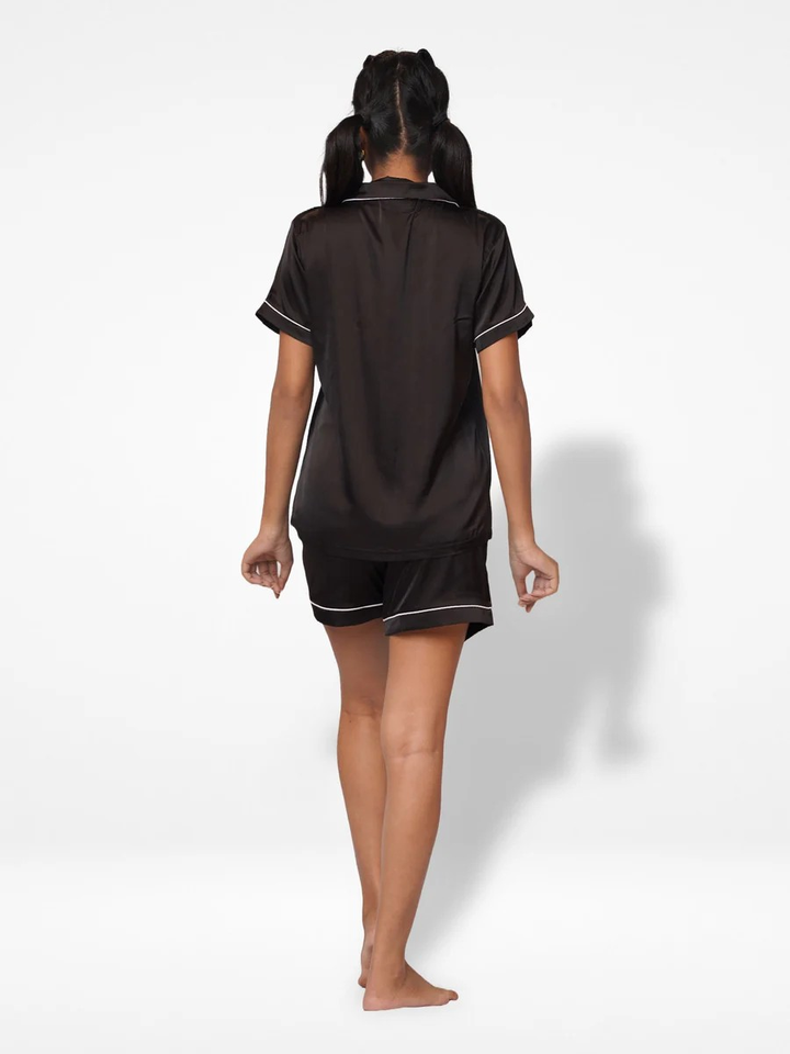 Satin Pajama Set for Women-Contrast Piping Turn-down Collar Drawstring Closure Short Sleeve Long/Short Pant Summer Breathable