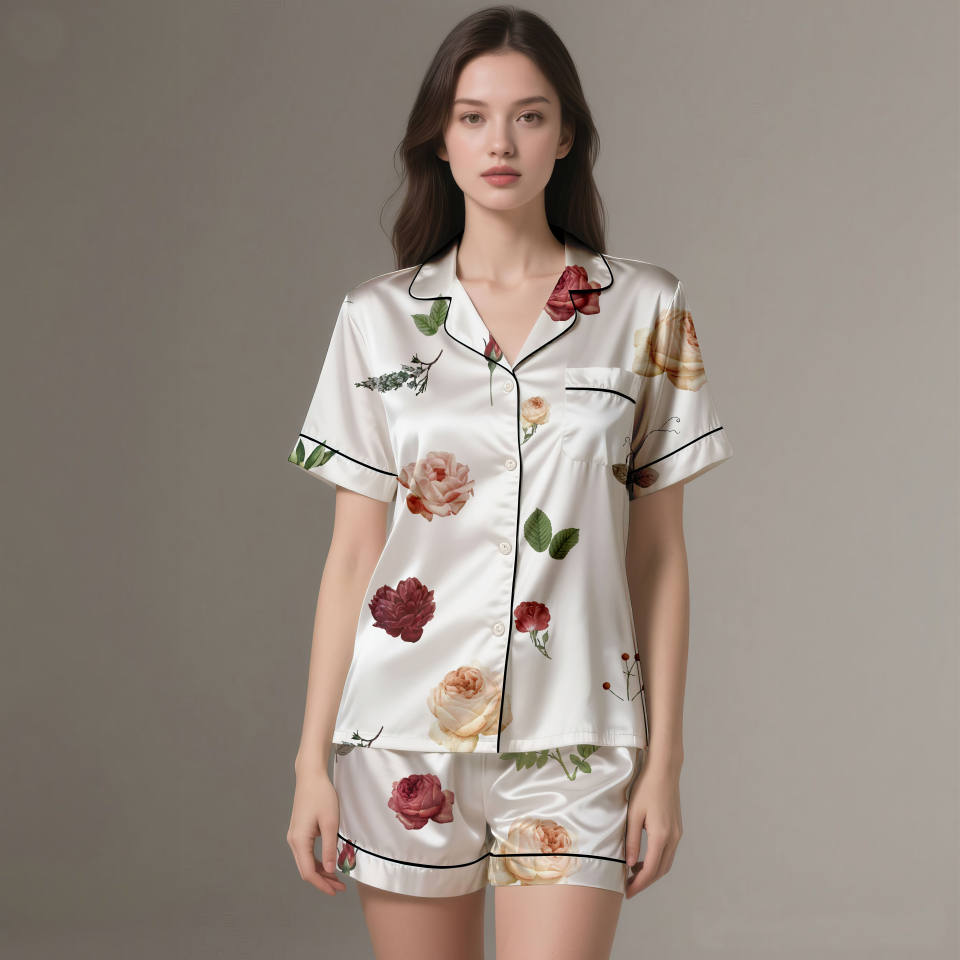 Satin Silk Breathable Pajama Set Elegant Floral Design Plus Size Women All Seasons