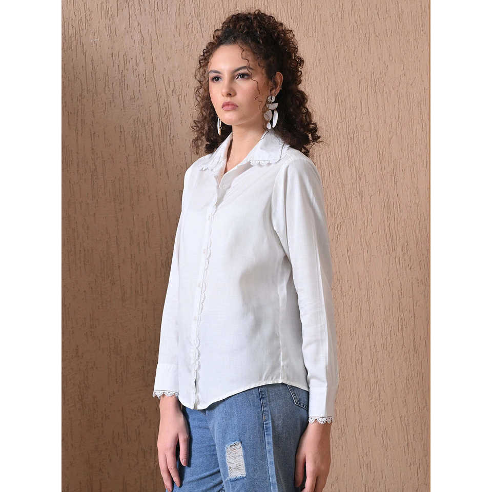 Scallop Lace Detailed Viscose Shirt Classic Cut with Modern Boho Touch Office Summer Woven Breathable Stand Collar