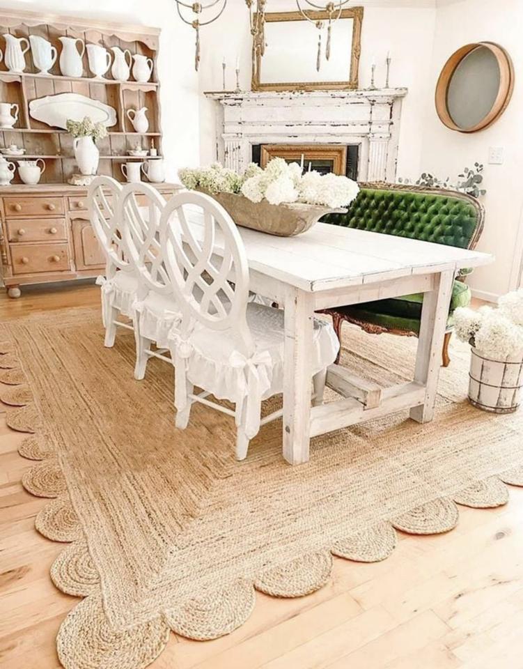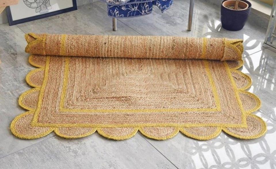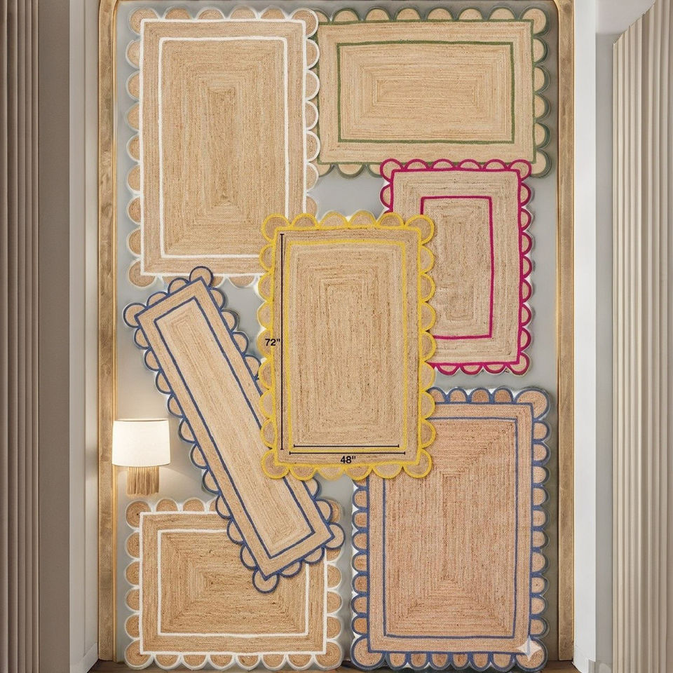Scalloped Edge Handmade Jute Area Rug Multi Color Borders Eco-Friendly Low Pile Boho Farmhouse Carpet Medium Thickness Spot