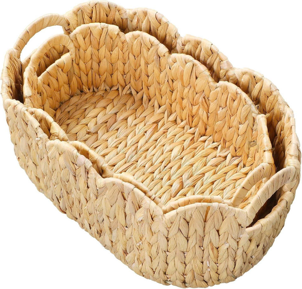 Scalloped Wicker Basket 2 Pack Hand-Woven Rattan Basket with Wooden Handles Water Hyacinth Woven Basket for Organizing and Decor