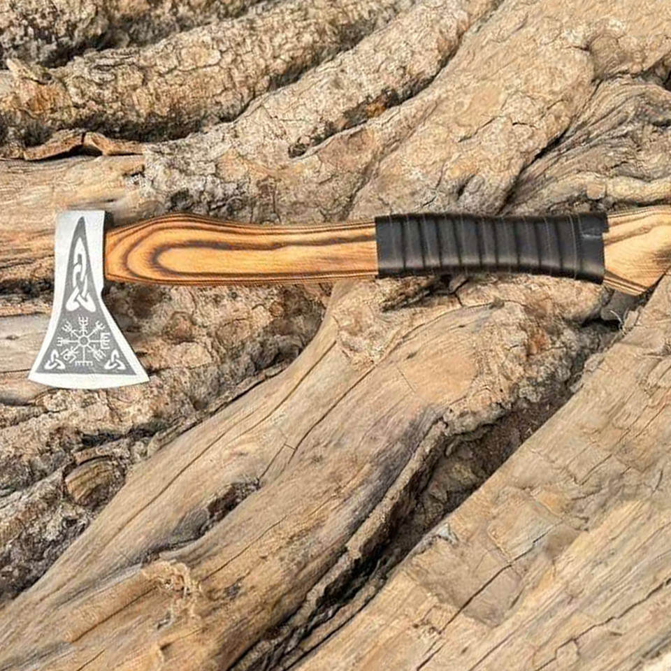 Scandinavian Industrial Viking Axe Heritage Inspired Engravings Leather Grip Wrap Natural Wood Finish for Outdoor Camping