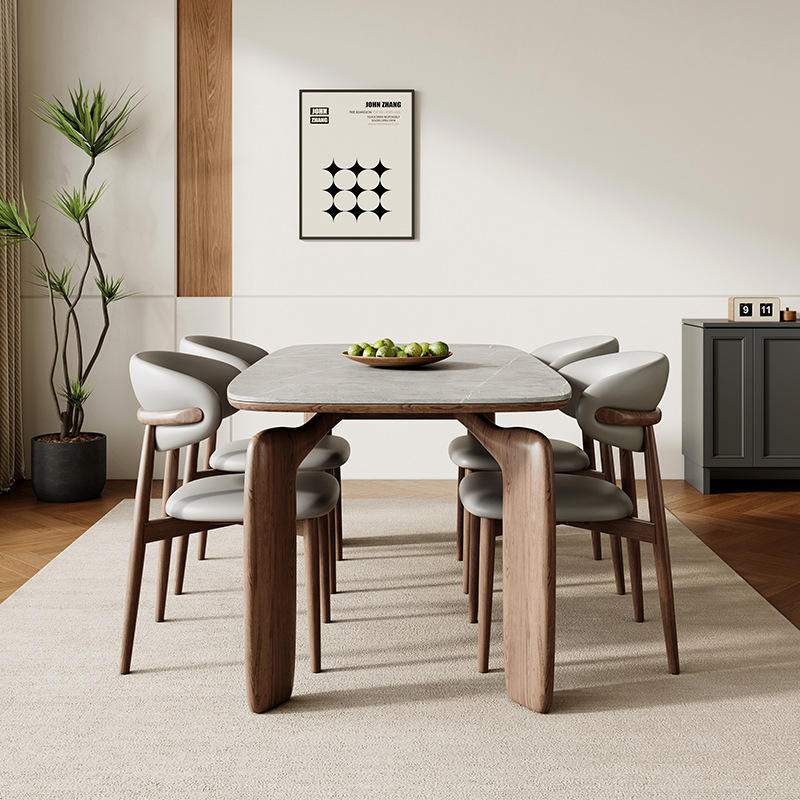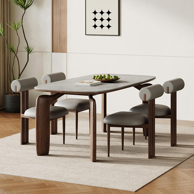 Scandinavian Solid Wood Rectangular Dining Table Walnut Color Matte Stone Top Modern Minimalist Dining Room Set 4 Piece