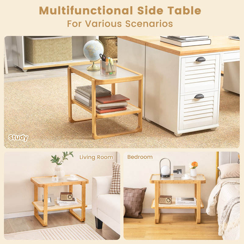 Scandinavian Style Bamboo End Table with Easy Assembly Glass Side Table for Living Room or Hotel Use