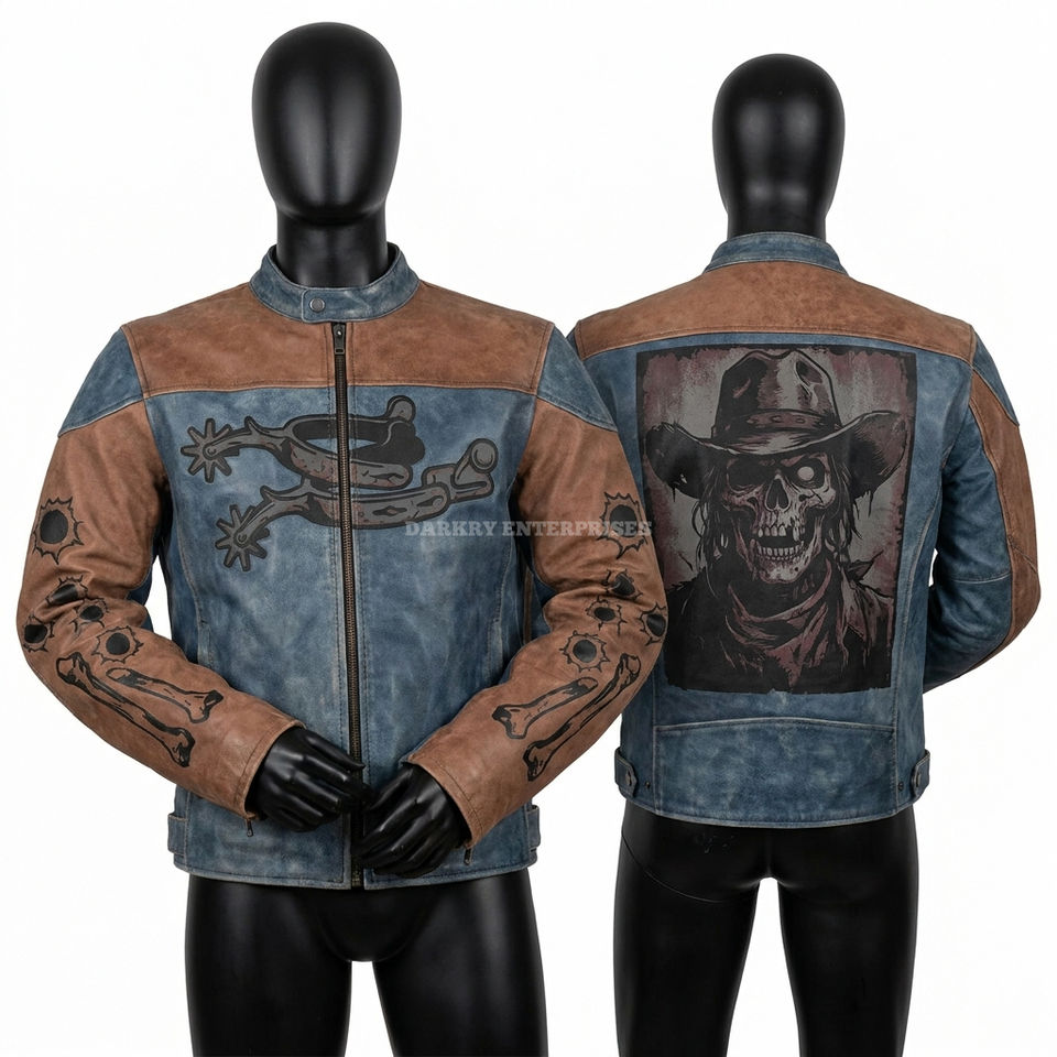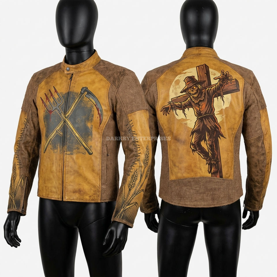 Scarecrow Harvest Racing Leather Jacket Tan Suede Texture Biker Coat Pitchfork Graphic Men Fall Streetwear Custom Fashion Out