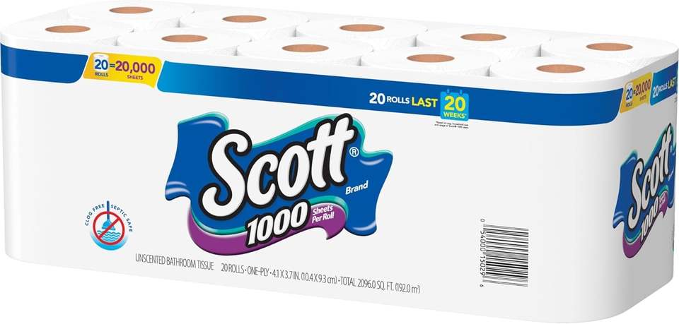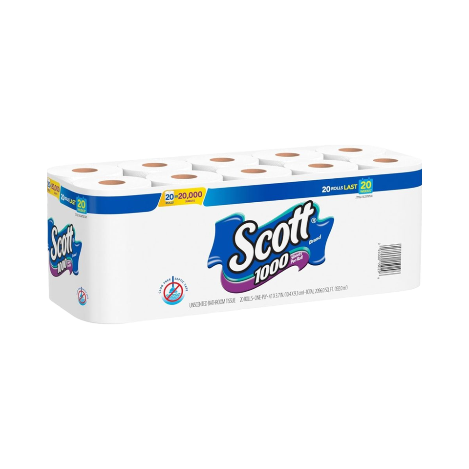 Scott 2 Ply Toilet Paper, 1000 Sheets Per Roll, Pack Of 20 Rolls