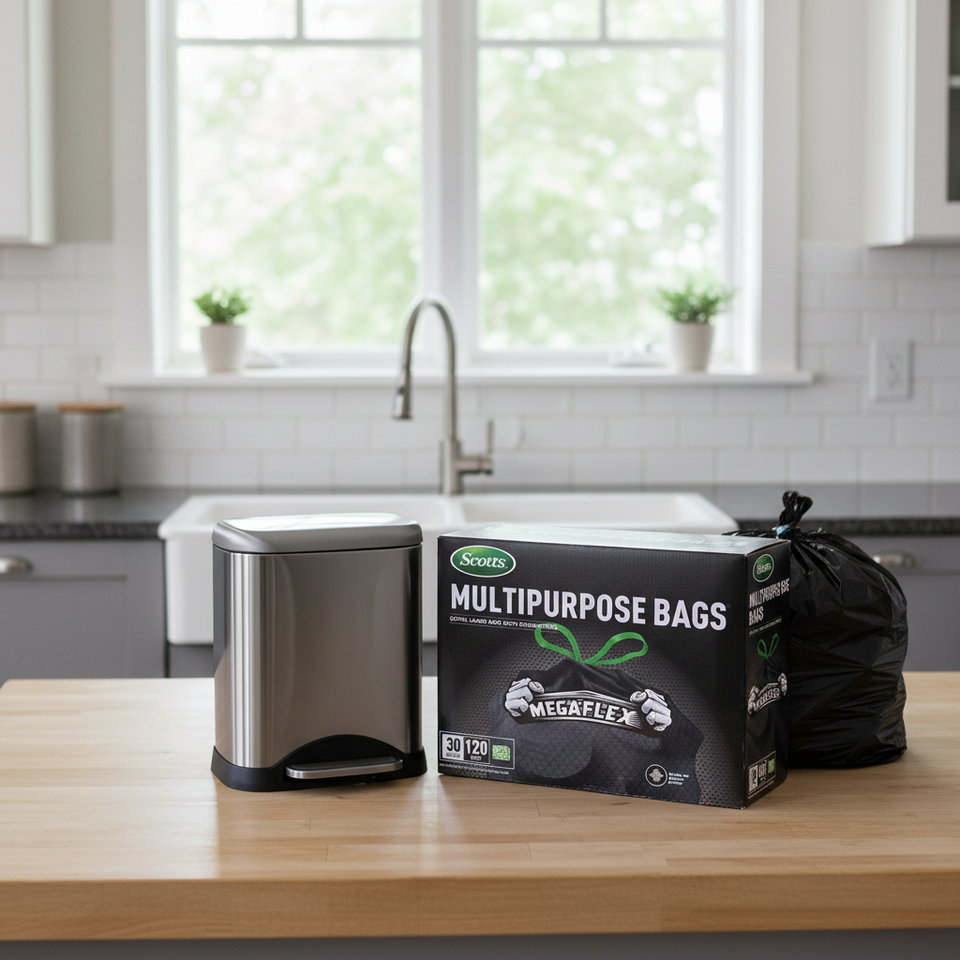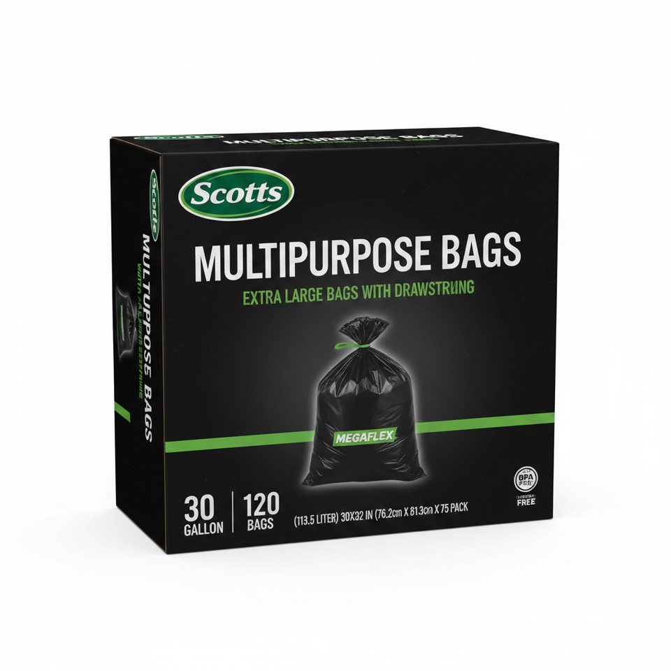 Scotts Large Drawstring Garbage Bags 120 Count 30-Gallon Box Disposable Non-Rip Black Household Trash Bags for Large Kitchen