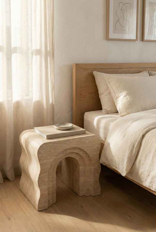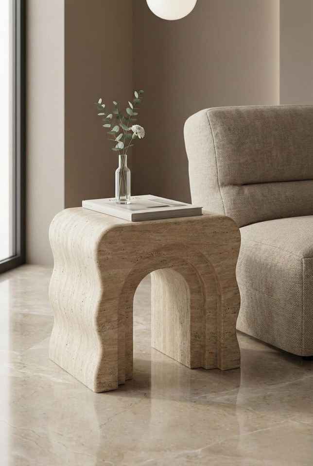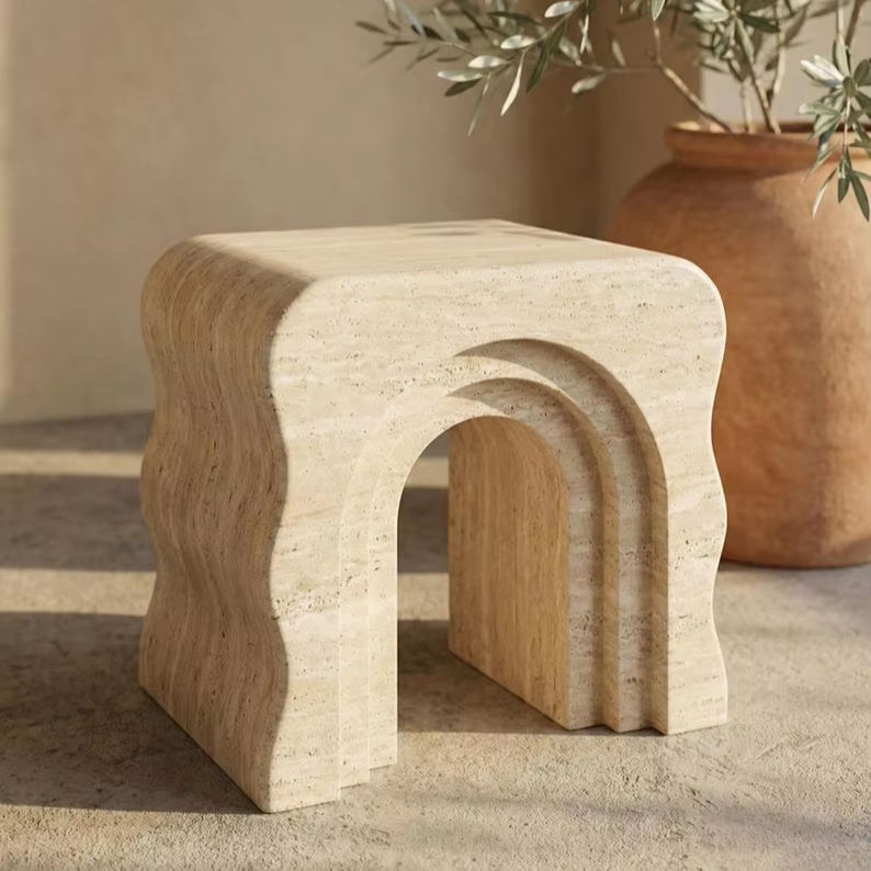 Sculptural Travertine Side Table Handmade Natural Stone Stool Modern Minimalist Bedside Table Organic Stone Furniture