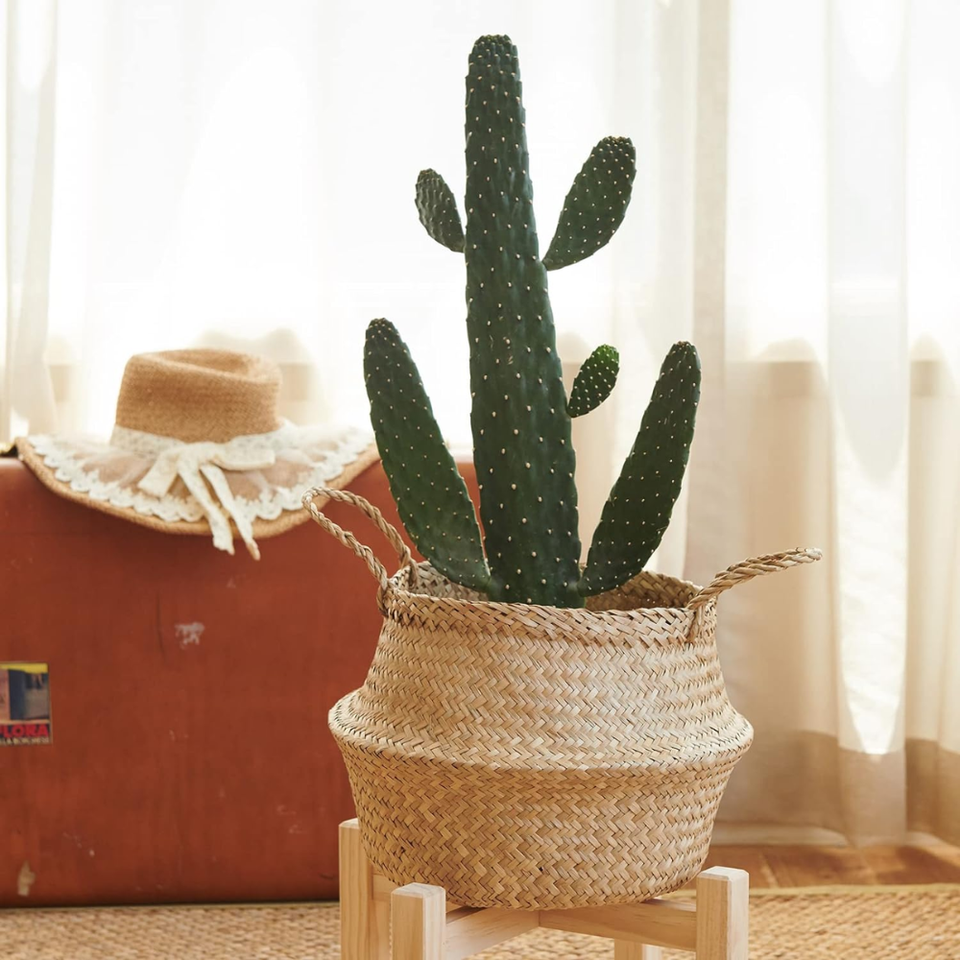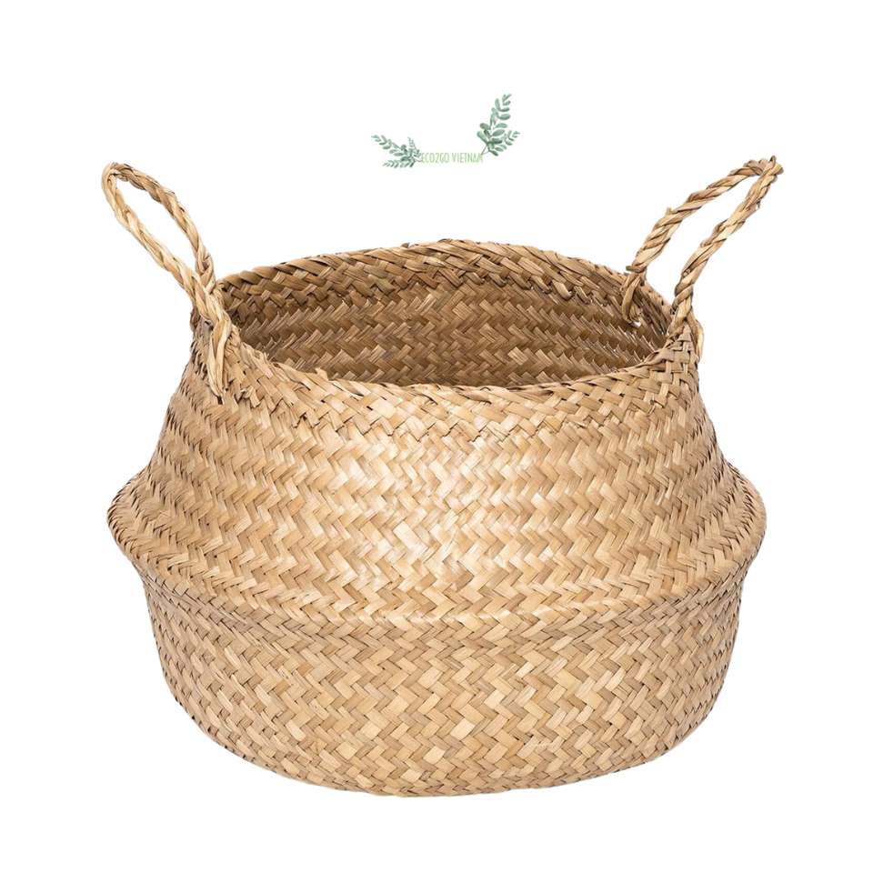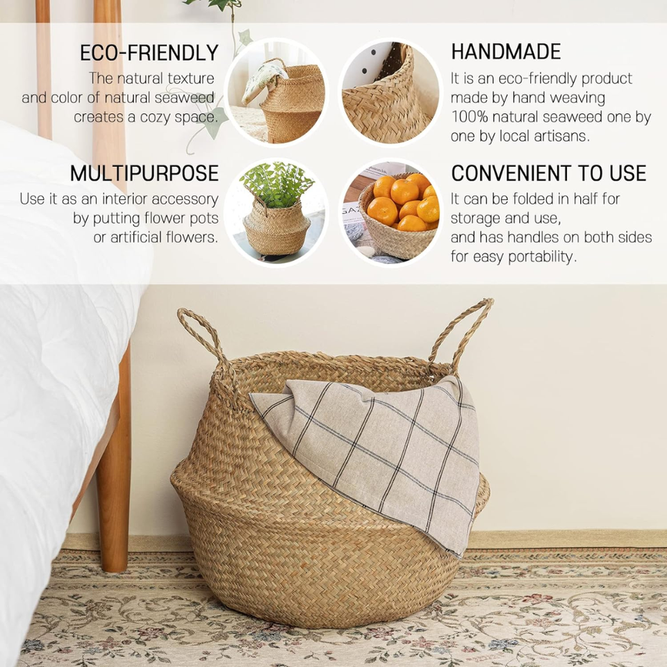 Seagrass Plant Basket, Seaweed Basket for Plant Pot, Hand Woven Belly Basket with Handles for Laundry, Picnic, Grocery Basket