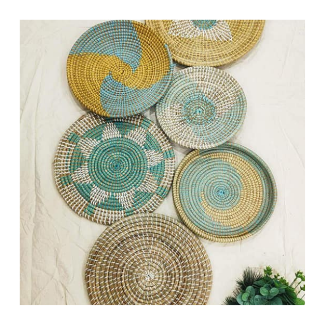 Seagrass Plate Basket Handmade Decorative Wall Hanging - Vietnam Rustic Eco-Friendly Seagrass Plate with Bamboo Rattan Accent