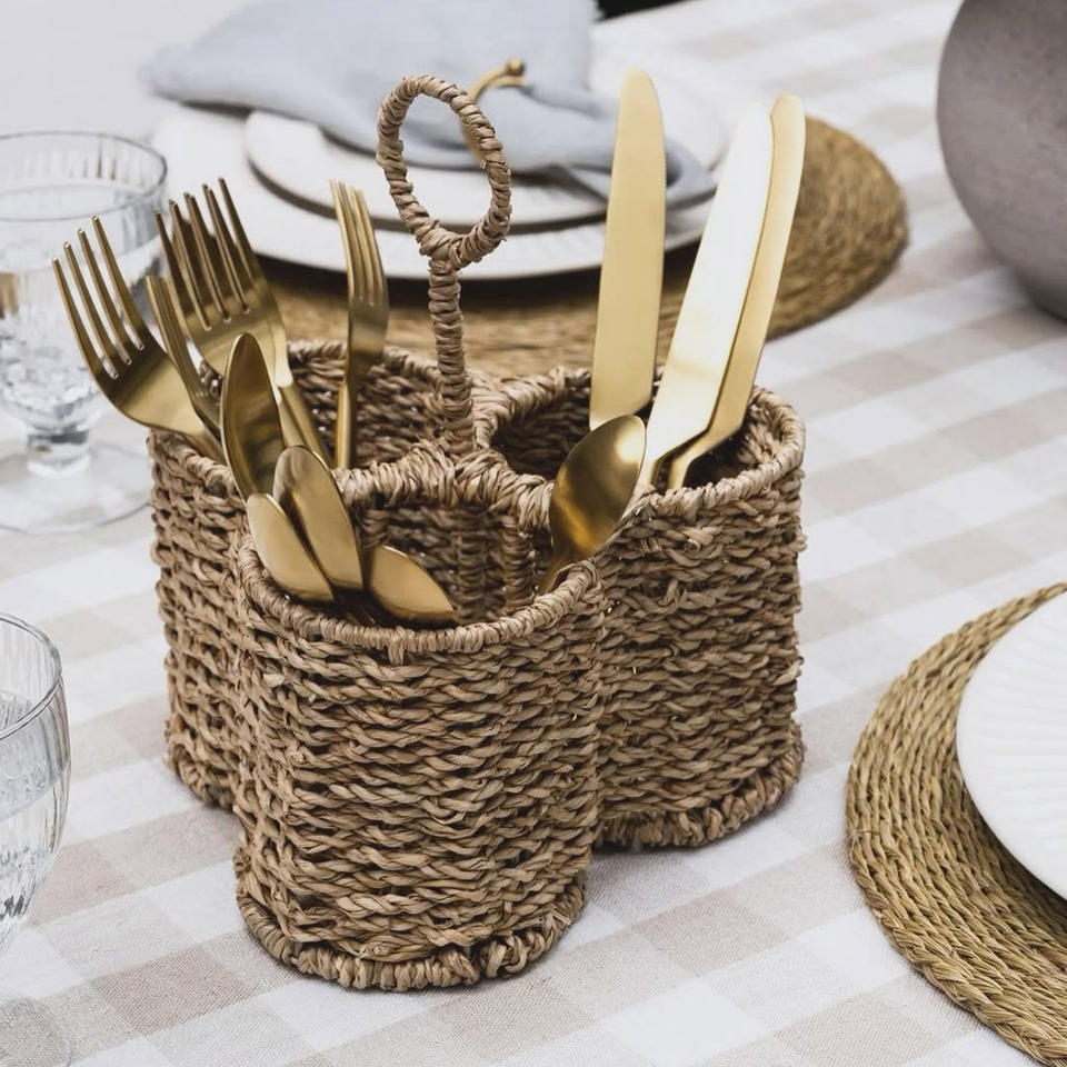 Seagrass Utensil Caddy Rattan Cutlery Basket Kitchen Storage Organizer Holder