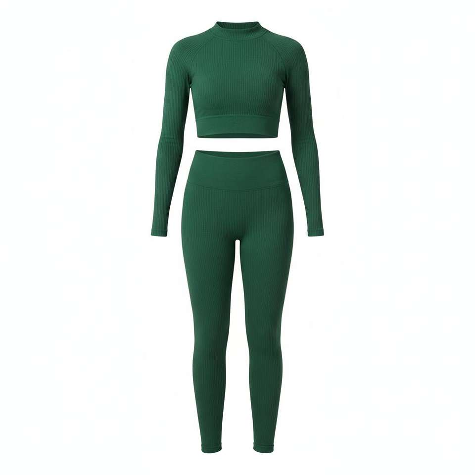 Seamless Ribbed Nylon 2-Piece Yoga Set Mock Neck Long Sleeve Crop Top & High Waist Tummy Control Sublimation Printed Leggings