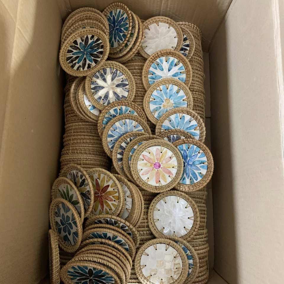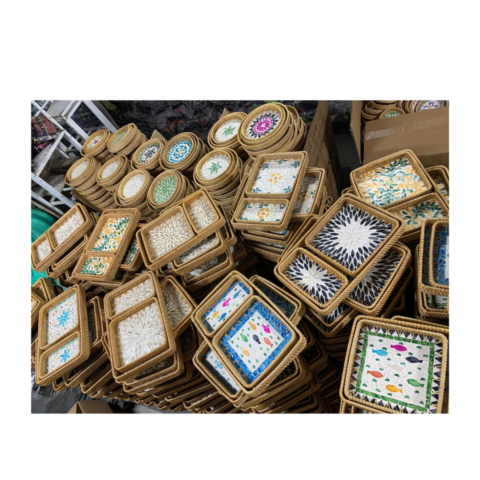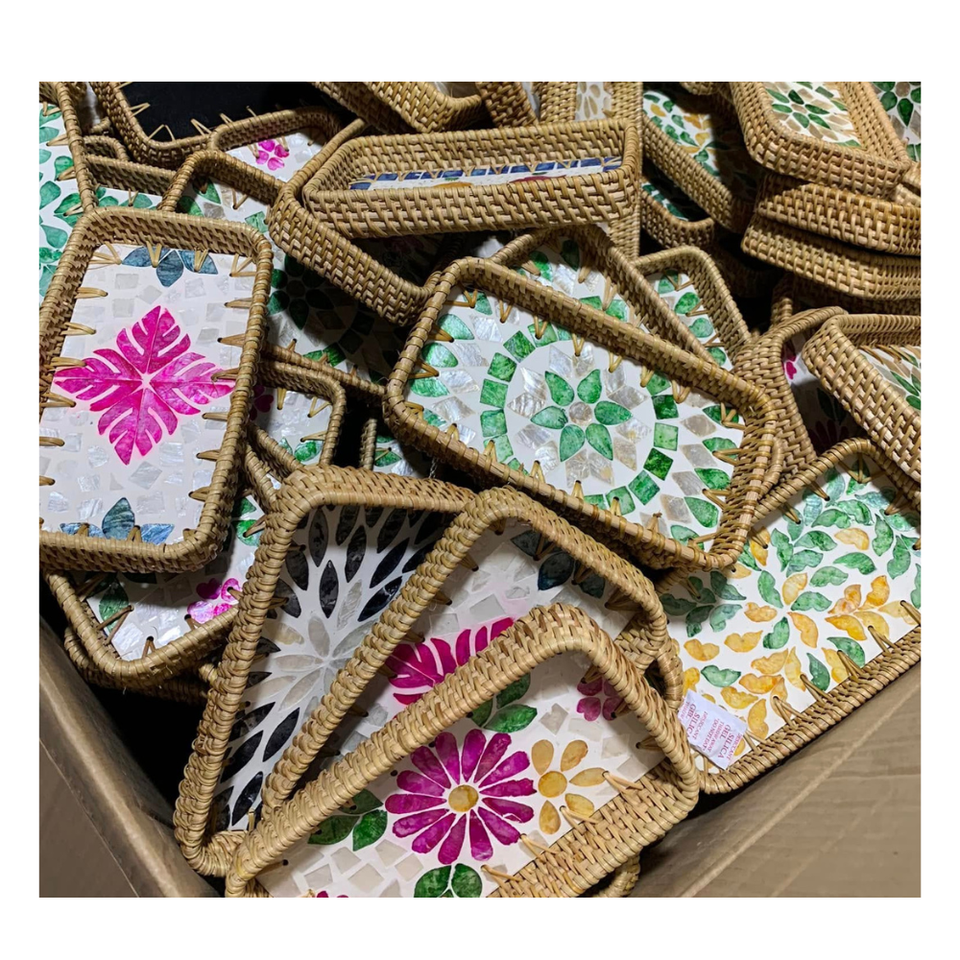 Seashell Inlaid Rattan Tray Handwoven Rattan Tray with Pearl Accents Natural Rattan Tray with Seashell Inlay