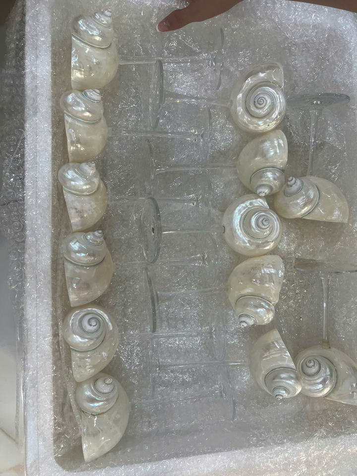 Seaside Shell Glass Ornaments on Brass Pedestal Boutique Hotel Interior Accent Coastal Shell Glass Decor with Brass Stand