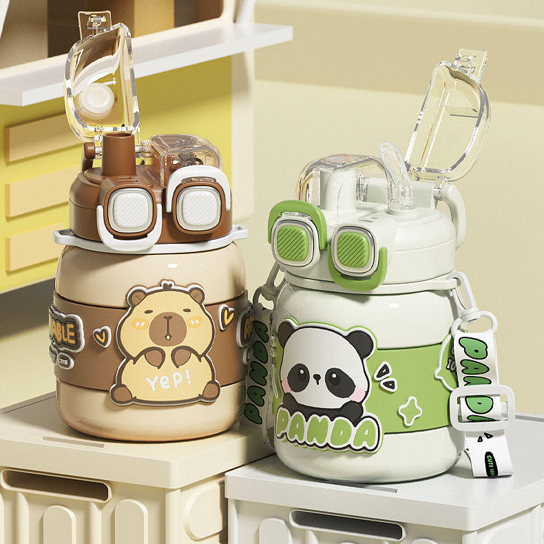 Seaygift Fashion New Trend 620ml Kids Cartoon Doll Panda Bear Thermos Cup Children Plastic Eco-Friendly Travel Water Bottle