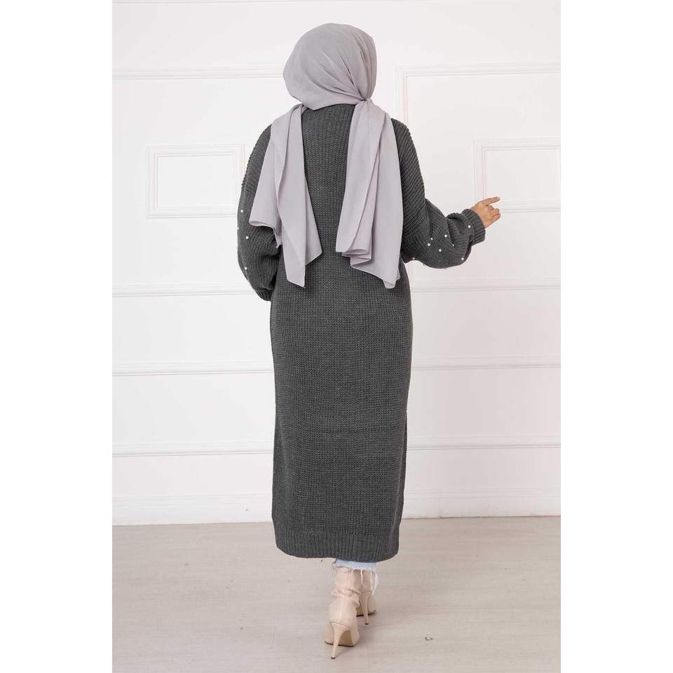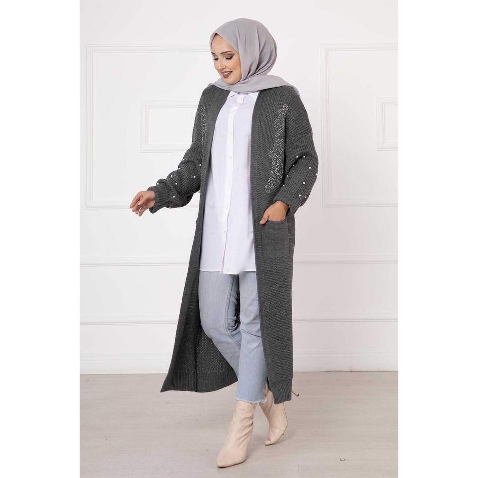 Selanik Knitted Cardigan with Pearl Detail Casual Plus Size Winter Autumn Acrylic Wool Cashmere Solid Print Pattern Anthracite