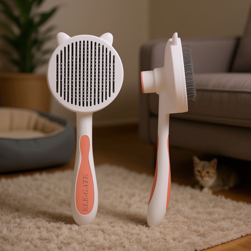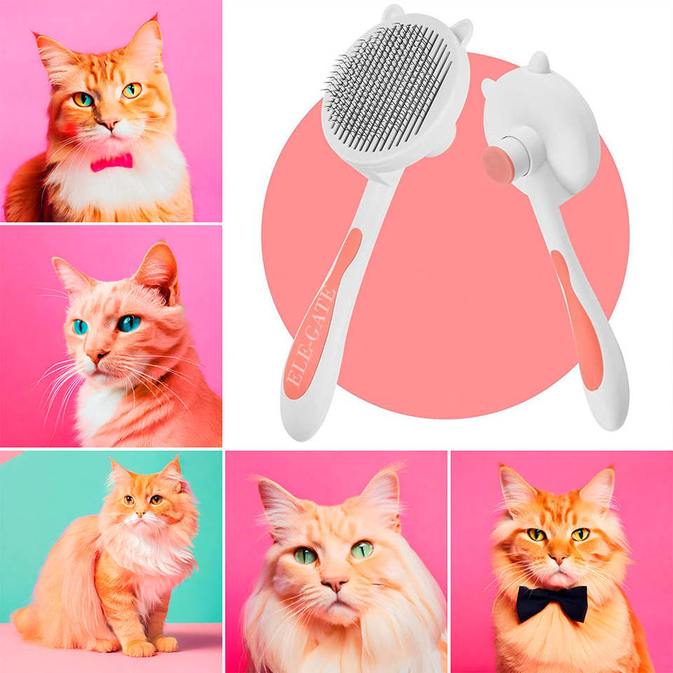 Self-Cleaning Kitten-Shaped Pet Brush With Nylon Bristles, Plastic Handle, Cute Design For Cats, ELEGATE Brand, Model MAS.07.11,