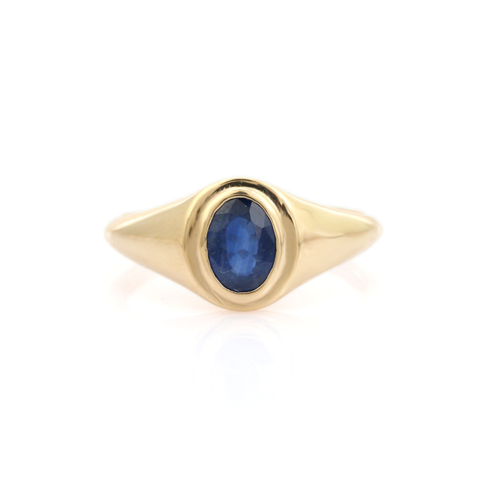 September Birthstone Real K14 Yellow Gold Handcrafted Natural Oval Cut Blue Sapphire Bezel Setting Signet Ring Women Jewelry