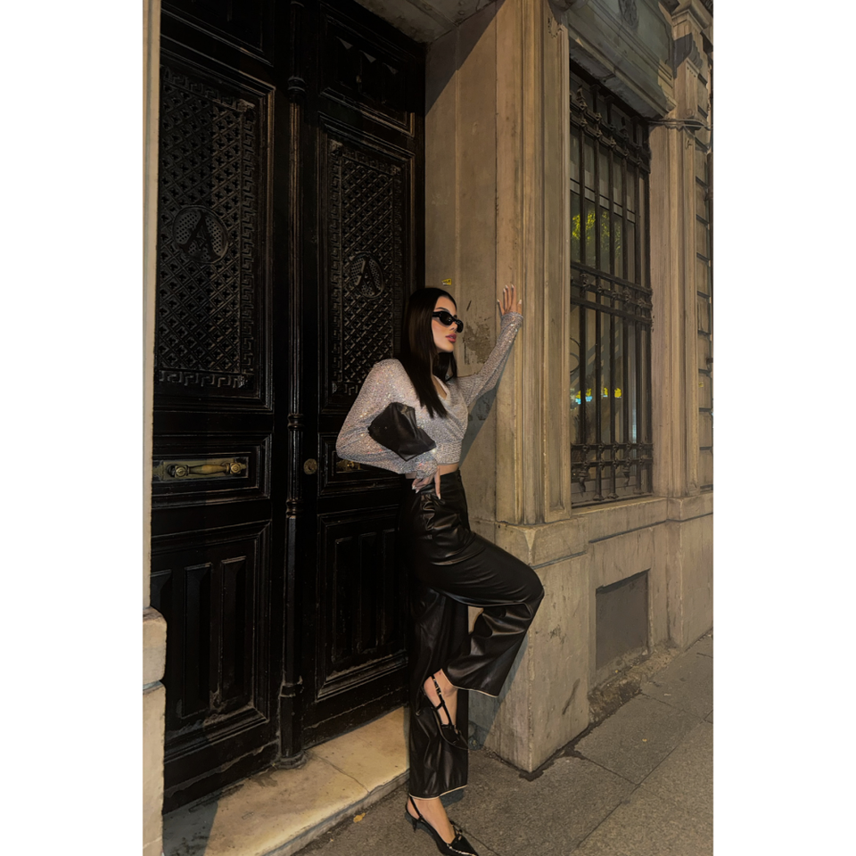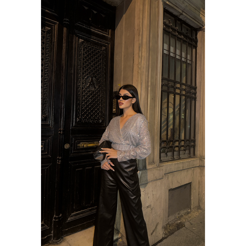 Sequined Crop Wrap Blouse Silver Women's Party Chic Sheer Layer Polyester Top
