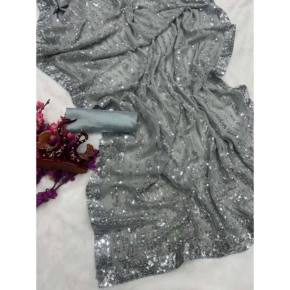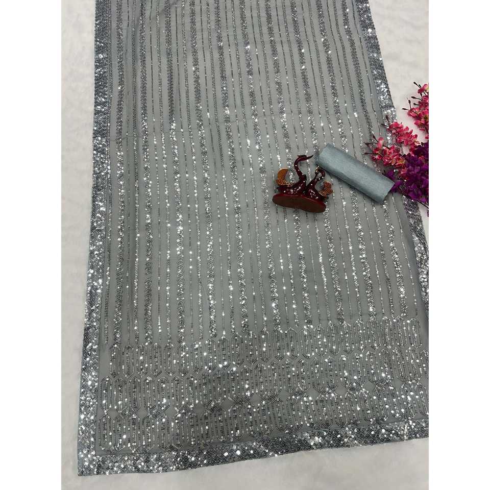 Sequins Embroidery Work Evening Dress Party Wear Saree with Lace Border