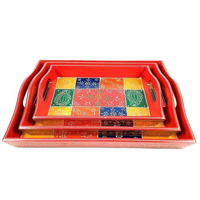 Serving Tray Set of 3 Handicraft Decorative Wooden Tray Breakfast Coffee Tea Trays Serving Trays for Snacks-for (Rectangular)