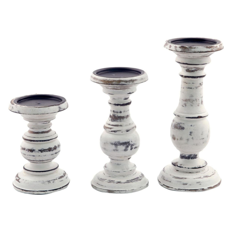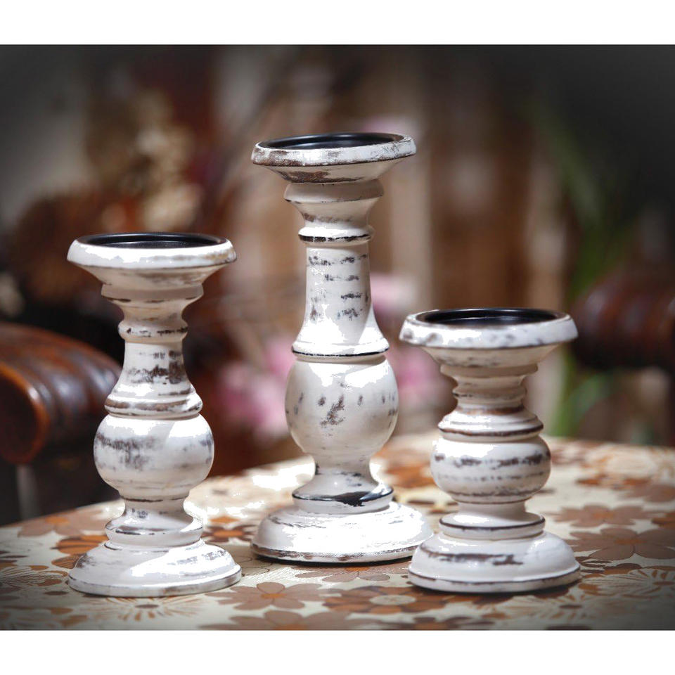 Set 3 Distressed White Mango Wood Candle Holders Hand Carved Wooden Candlestick Stands for Home Decoration Wholesale Supply Low