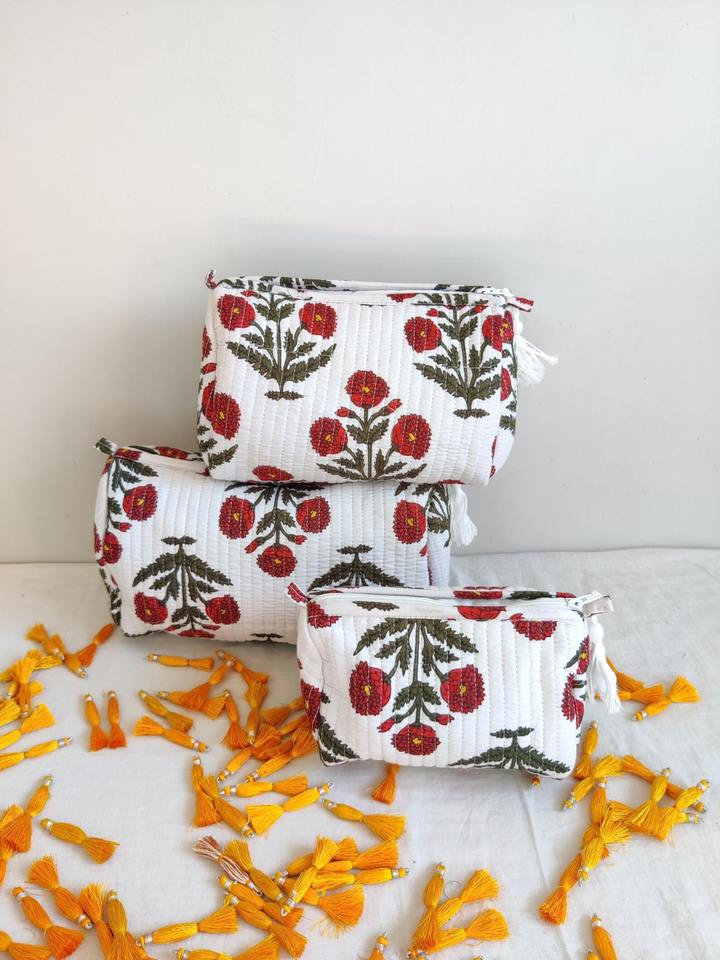 Set 3 Eco-Friendly White Floral Cotton Makeup Bags-Quilted for Wash Bag Hand Block Print Pouch Large Vintage Style Travel