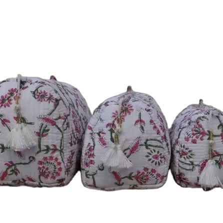 Set 3 Indian Cotton Floral Print for Toiletry Bags Quilted Wash Bag Shaving Kit Vanity Case Zipper Closure Fashionable Travel