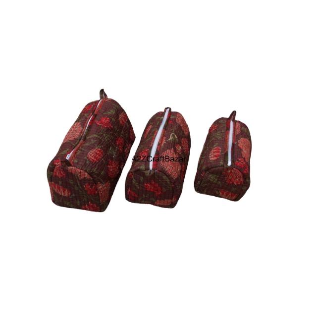 Set 3 Indian Cotton Floral Print Makeup Bags Eco-Friendly Quilted Zipper Closure Long-Lasting Travel Pouches Wholesale