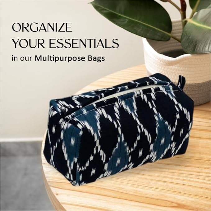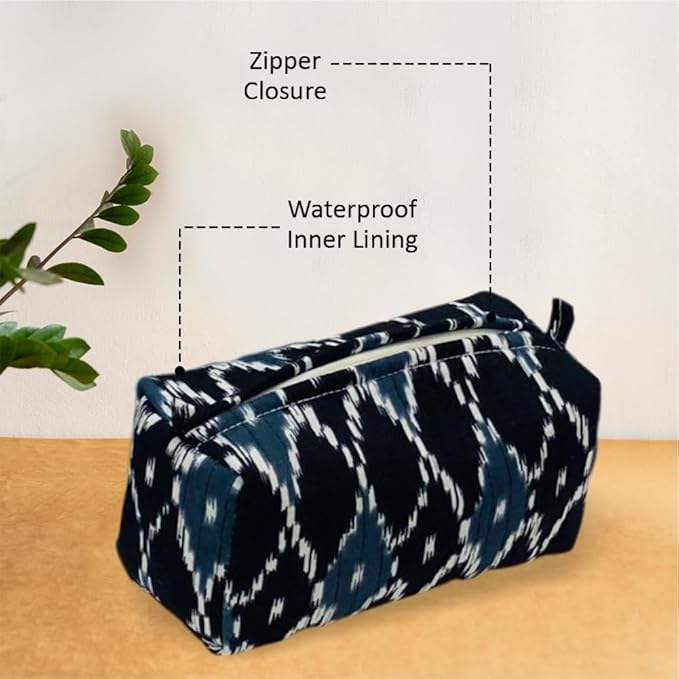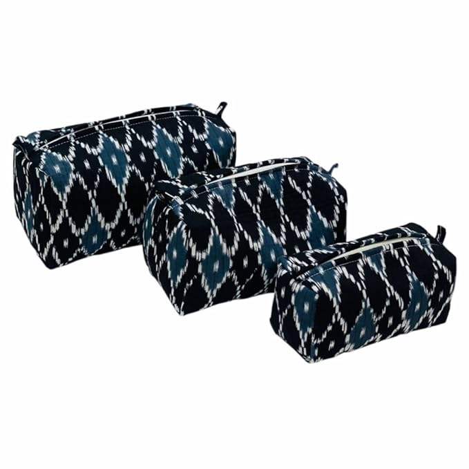 3-Piece Pure Cotton for Bags Zipper Hand-Block Abstract Blue Design Water Resistant Eco-Friendly Durable Cosmetic Travel