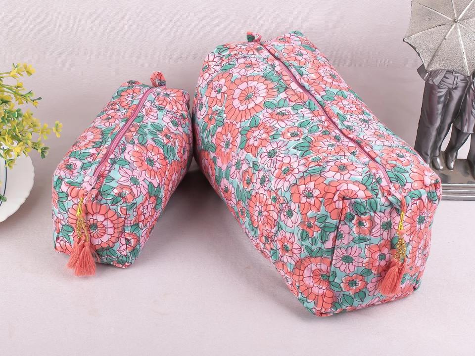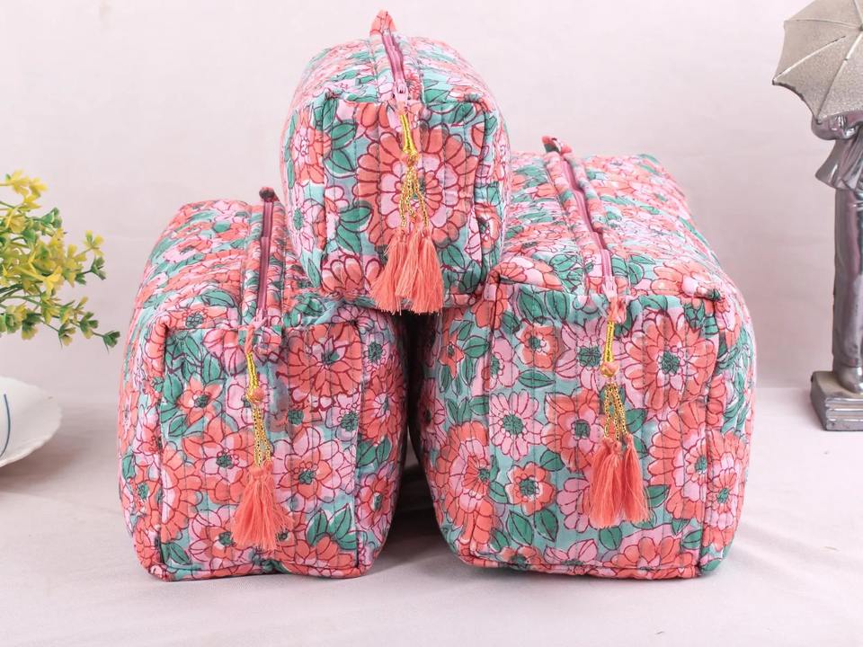 Set 3 Eco-Friendly Quilted Vintage Floral Print Cotton Makeup Case Water Resistant Zipper Travel Case Large Medium Small Sizes