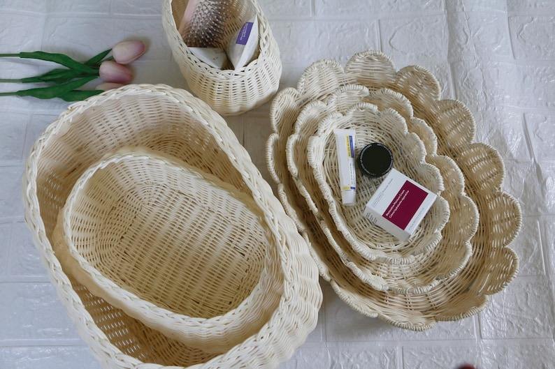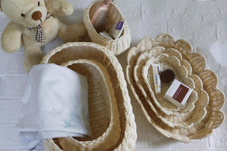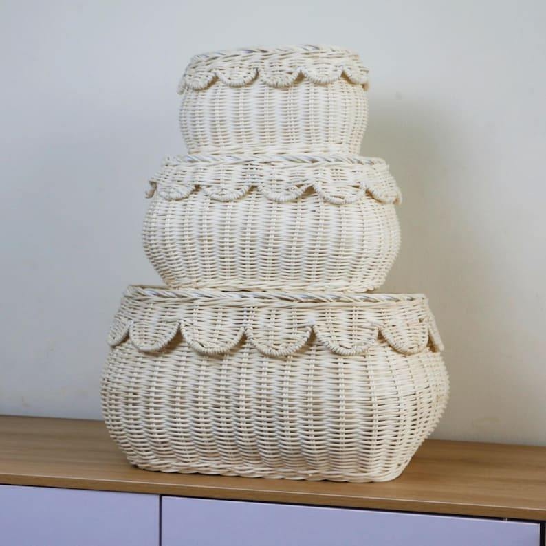 Set 3 of Scalloped Basket, Rattan Storage Box with Lid Handmade Wicker Organizer, Toy Box Kids Room Organizer